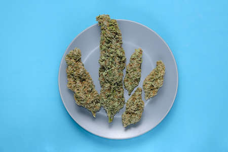 Micro-dosing concept. Cannabis drying flowers on a plate, blue layout. Marijuana blooms. Hemp buds in the middle of a table. Top view, flat lay.