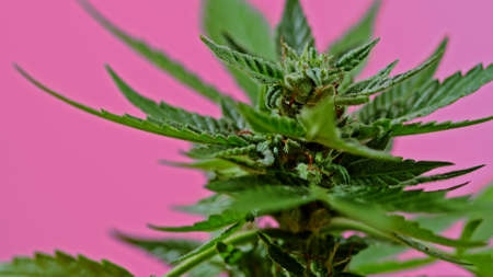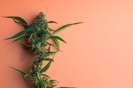 Alternative medicine represented by medical marijuana, female cannabis shrub texture. copy space, close up. Branches of Medical Marijuana with flower bud sites Cannabis cultivation