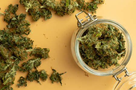 Jar with legal cannabis top view. Marijuana background. Weed buds.