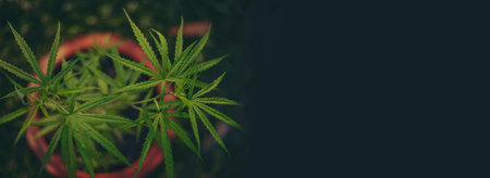 Banner Green weed Marijuana tree cannabis plant herbal in greenhouse. Panorama Hemp leaf made cannabis crude oil medicine farm. THC herb agriculture Weed leaf with copy space
