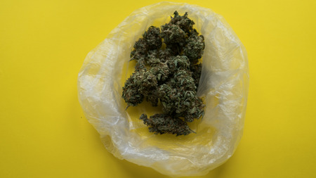 Package zip lock with cannabis buds. Street drug business. Illegal marijuana selling. Criminal weed concept.