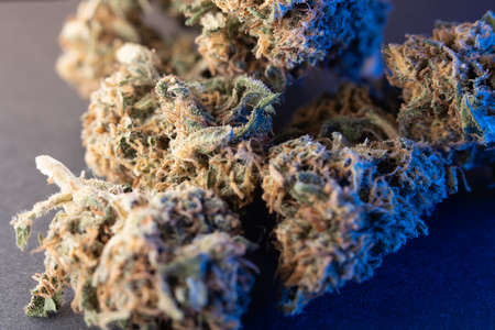 Medical marijuana, inflorescences of shinki weed plant on blue background.