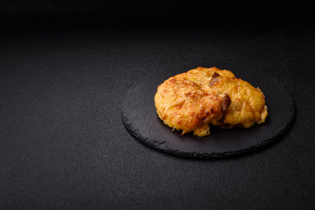 Delicious fresh fried minced fish cutlets with spices and herbs on a dark concrete background