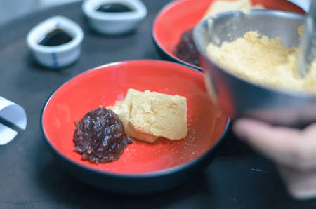 Kinako Mochi ( rice cakes coated with mixed powder roasted soybean flour and sugar), a Japanese traditional dessert