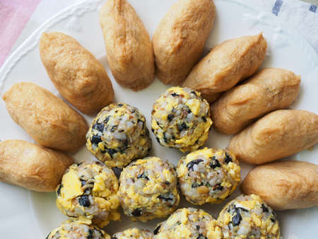 Asian food ham and vegetables rice balls and Yubu Sushi