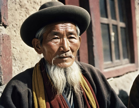 A traditional elderly Tibetan man 70 years old with a distinct features poses against a rustic background, reflecting his rich cultural identity and heritage. Wise serious direct gaze. Generative AI.