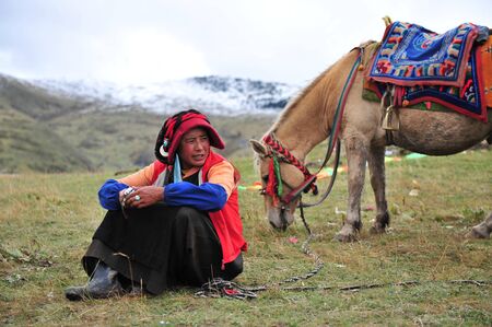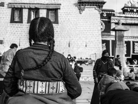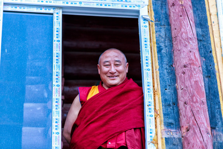 LHASA, TIBET, CHINA - AUGUST, 17 2018: Tibetan monks in the Ganden Monastery located at the top of Wangbur Mountain, Lhasa Tibet