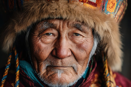 An elderly man with deep-set eyes and a traditional fur has embodies a lifetime of experiences and stories.