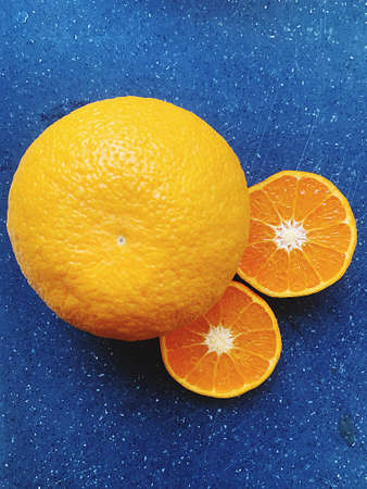 Ripe cut orange on blue pastel background. Side view, copy space, hard light. Tropical, healthy food concept, minimalism.