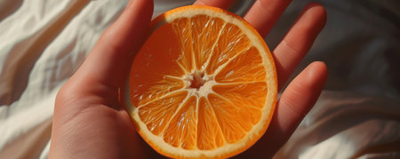 Hand holding a half sliced orange on a sunny day, natural light. Freshness and healthy eating concept