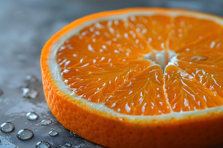 Detailed close-up of a fresh orange slice with visible water droplets on a metallic surface. the vibrant color and texture highlight freshness, health, and nutrition, making it ideal for food advertising, healthy eating campaigns, and design purposes. Generative AI