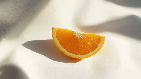 A juicy orange slice with a soft shadow, floating over a white background for a clean composition.