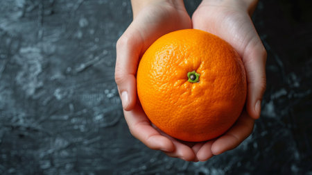 Close-up of a hand holding a fresh orange against a vibrant, colorful background, highlighting the fruit's texture and juiciness.