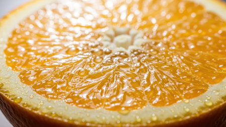 This close-up showcases a halved orange, highlighting its textured interior and bright citrus color. The image is brightly lit, emphasizing the details of the fruit's segments. Suitable for illustrating health, nutrition, or culinary themes, the image can be used in various commercial and editorial applications.