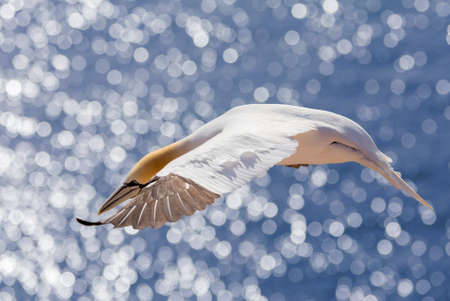 Northern gannet (Sula bassana), beautiful flying sea bird with blue sea water in the background, Helgoland island, Germany