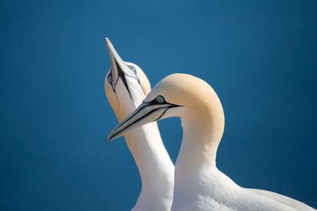 Northern gannet (Sula bassana), detail head portrait of beautiful sea bird, birds in love with blue sea water in the background, Helgoland island, Germany