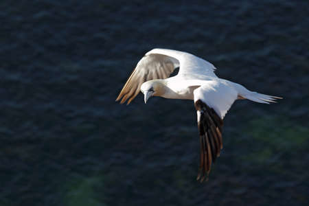 Northern Gannet (Morus bassanus) in flight over the cliffs of Heligoland.