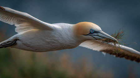 A gannet bird is captured mid-flight, carrying nesting material. The bird features white plumage with a yellow head and a long, pointed beak. The image displays a shallow depth of field, with a blurred background. This photograph could be utilized for wildlife documentation or nature-related editorial purposes.