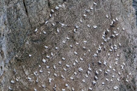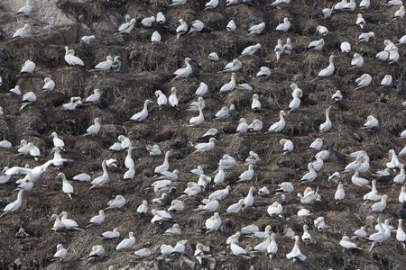 A breading colony of northern gannets (Morus bassanus) on a cliff in the Atlantic Ocean.
