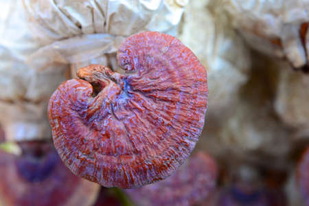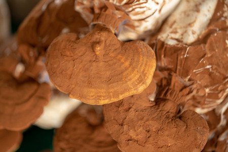 Fresh Lingzhi mushroom, Ganoderma lucidum or Reishi mushroom in farm. Chinese traditional medicine. Soft sunlight. Shallow dept of field. Close-up. Top view. Background, Texture.