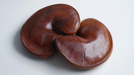 A Reishi mushroom with its surface in sharp focus, laid on a clean white background for a simple, impactful image.