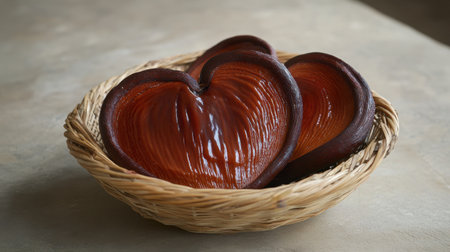 Enchanting heart-shaped bowls crafted from glossy material, presented in a woven basket, perfect for adding charm to any kitchen or home decor.