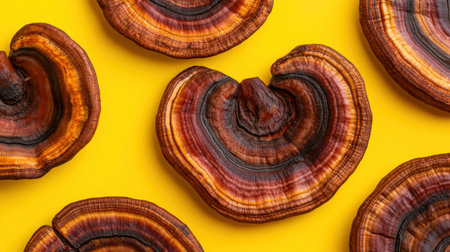 A stunning arrangement of natural fungi showcases rich hues of brown and orange against a bright yellow background, perfect for creative projects and nature themes.