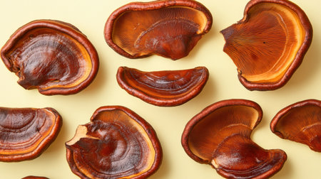 This image showcases vibrant mushroom slices in warm tones of orange, red, and brown, beautifully arranged on a soft yellow background, perfect for nature-themed projects.
