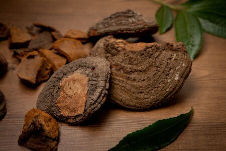 Chaga tea - a strong antioxidant, boosts immune system, has detox quality, improves digestive. Healthy drink in a clear cup next to a whole birch mushroom and ground powder. Rustic style.