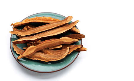 Dried lingzhi mushroom slices on white background