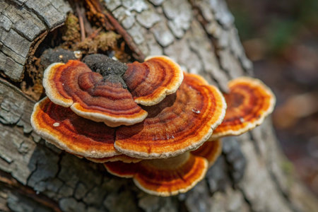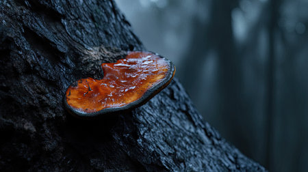 Isolated Reishi mushroom growing from tree bark with morning dew and natural light