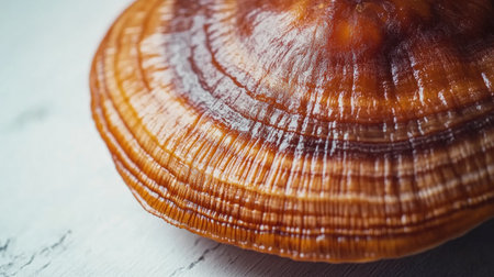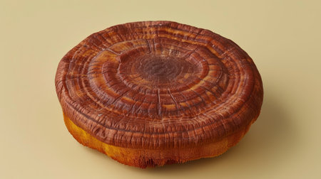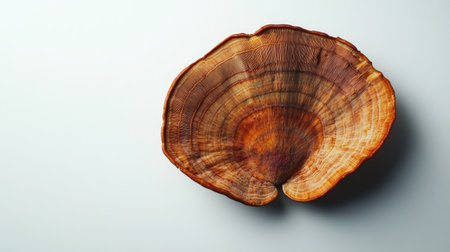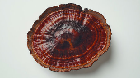 Captivating top view of a large reishi mushroom displaying intricate patterns and vibrant colors against a neutral backdrop, perfect for nature-themed designs.