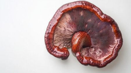 This stunning image features a large reishi mushroom viewed from above, showcasing its rich colors and intricate textures against a clean white background. Perfect for nature and wellness themes.