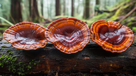 Mystical Reishi mushrooms on a rustic wooden surface, showcasing variegated caps in a forest-inspired display AI