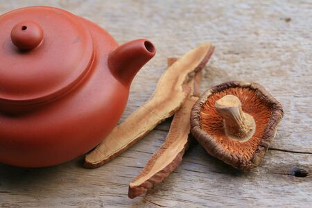Ganoderma Lucidum - Ling Zhi Mushroom and tea pot on black background