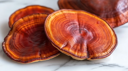 Close-up of vibrant red mushroom slices showcasing unique texture on a smooth marble surface, ideal for culinary, wellness, or decorative use.