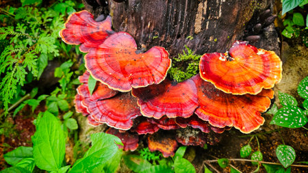 beautiful wild reishi mushroom in rain forest at sunrise