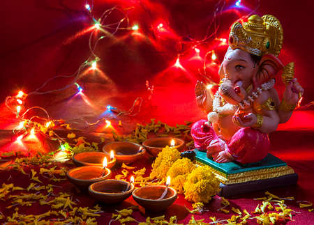 Clay diya lamps lit with Lord Ganesha during Diwali Celebration. Greetings Card Design Indian Hindu Light Festival called Diwali