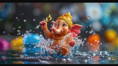 A vibrant depiction of a joyful Ganesh idol splashing in water, symbolizing celebration and spirituality. The colorful background adds artistic flair, perfect for festive themes.