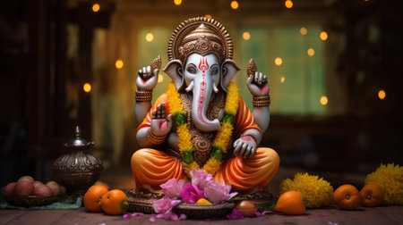AI Generative Indian religion god Ganesh at traditional India Hindu festival of Diwali festive