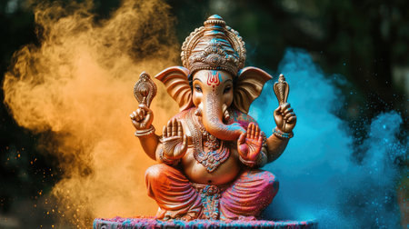 This stunning image features a vibrant Ganesh idol surrounded by colorful powders, symbolizing joy and celebration during Hindu festivals, showcasing artistry and tradition.