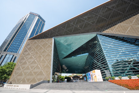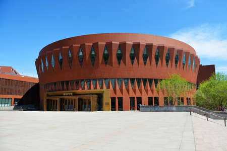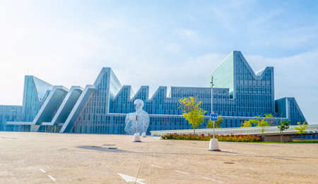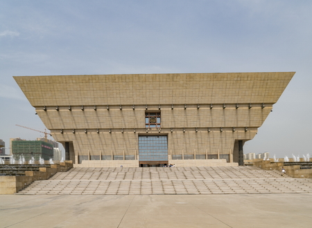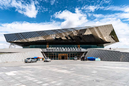 Chengdu, Sichuan province, China - July 2, 2020: Chengdu museum building facade against blue sky near Tianfu square in the center of the city.