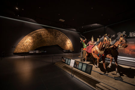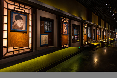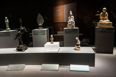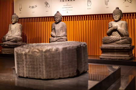Dazu, China- 6 Nov 2025: Collection of ancient stone craved artwork inside Dazu Stone Carving Museum in Chongqing, China. The museum houses a large number of precious stone carving cultural relics