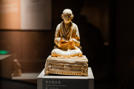 Ancient Buddhist Monk Statue Seated in Meditation Displayed in Museum Gallery