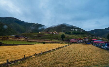 Beautiful sunset and meadow at Napa Lake Grassland, located in Zhongdian city ( Shangri-La). landmark and popular spot for tourists attractions in Yunnan, China. Asia travel and Autumn season concept