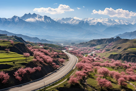 Winding Road Through Springtime Landscape Blooming Cherry Blossoms and Majestic Mountain Scenery