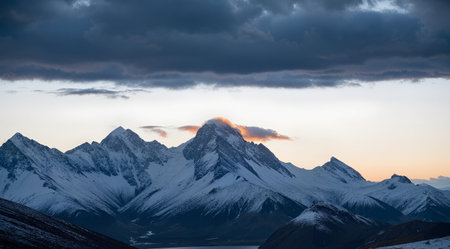Mountain Landscape, Snow Covered Mountain Range - Daocheng Yading Nature Reserve. Ganzi, Garze, Kham Tibetan area of Sichuan Province China. Dramatic lighting during sunset, Clouds and Blue Sky
