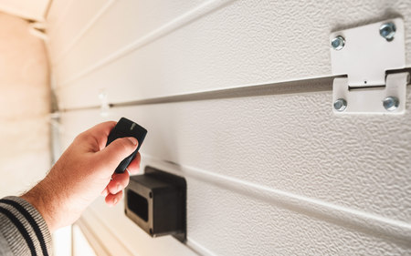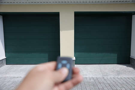 Closeup hand holding and using remote control to open the automatic shutter roller steel garage gate. Security system and wireless concept. Electronic door concept.