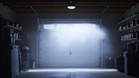A serene garage interior featuring soft light and a misty atmosphere, creating an inviting space for creativity and inspiration in projects.