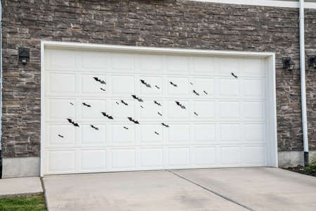 White sectional garage door with bat stickers displays